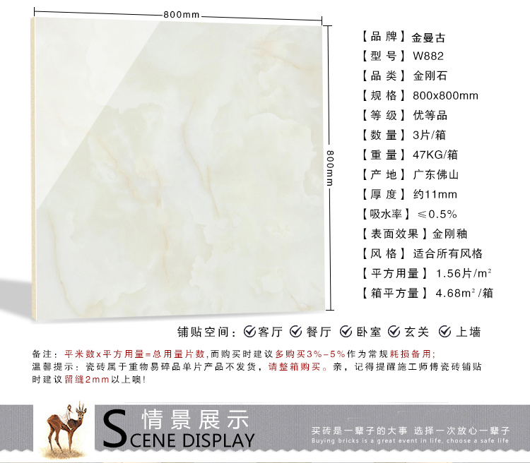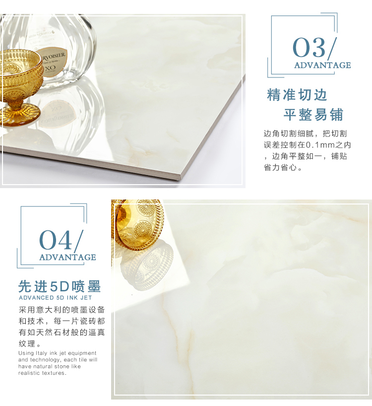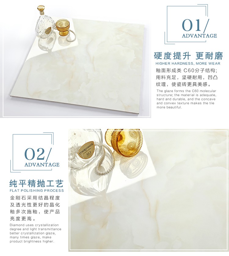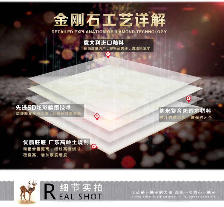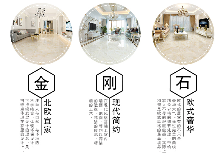 金曼古瓷磚廠家特價金剛石因高品質(zhì)而得名,是一款極具天然石材效果和微晶石質(zhì)感的仿石材瓷磚,它不但在價格、環(huán)保、耐用和清潔上極具優(yōu)勢,在質(zhì)感、規(guī)格、花色、重量等指標上,金剛石都遠遠勝于石材、拋光磚。相比其他種類的產(chǎn)品,它最大的特點可以用“高亮度、高耐磨、高平整、高逼真、高清晰、高環(huán)保”。