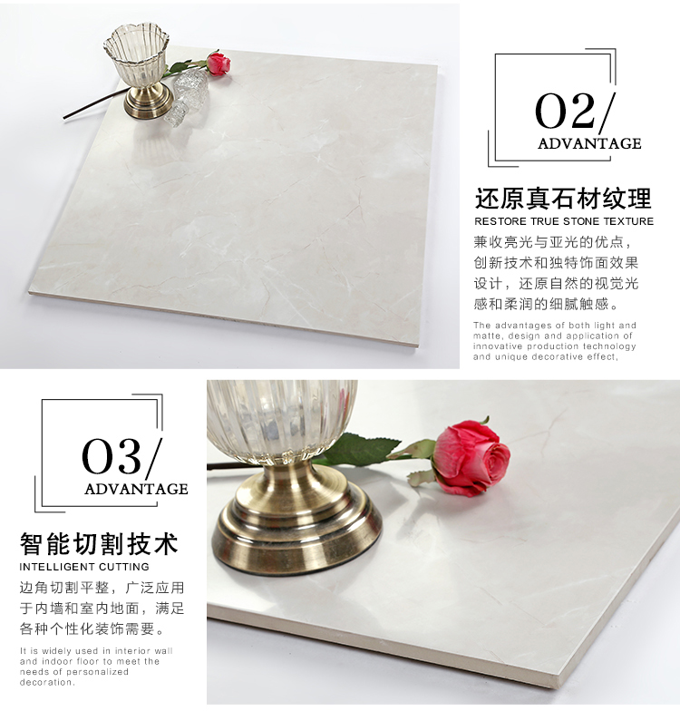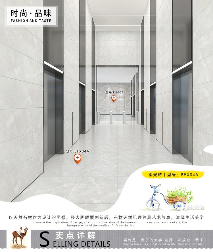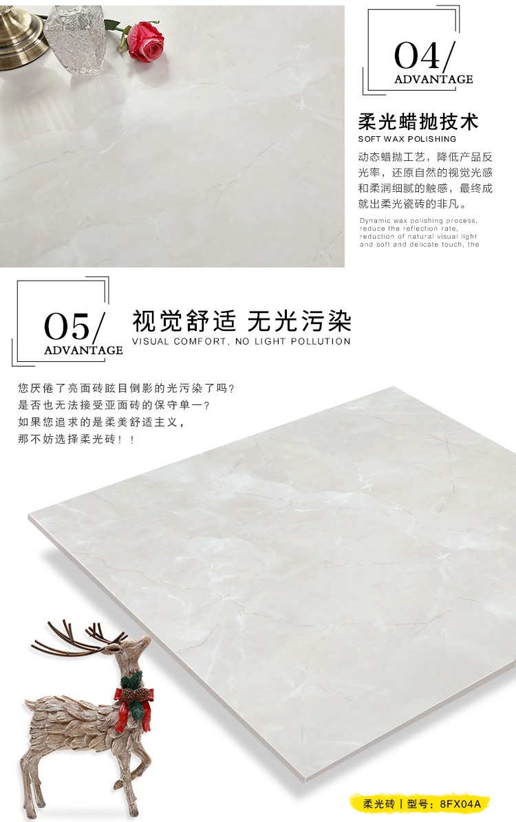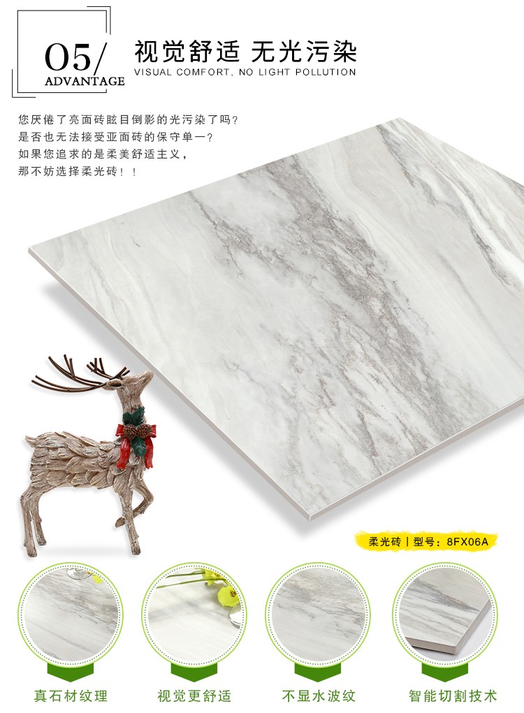 柔光瓷磚是磚面反射介于強(qiáng)光與弱光之間的一類瓷磚,其結(jié)合亮光類瓷磚的高調(diào)明艷裝飾和啞光類瓷磚的低調(diào)內(nèi)斂搭配效果,通過動態(tài)柔光蠟拋技術(shù),降低產(chǎn)品反光率,從而達(dá)到人體舒適的視覺感受以及無光污染的空間裝飾效果。優(yōu)點:1.視覺舒適,無光污染 2.堅固耐磨,不易刮花.