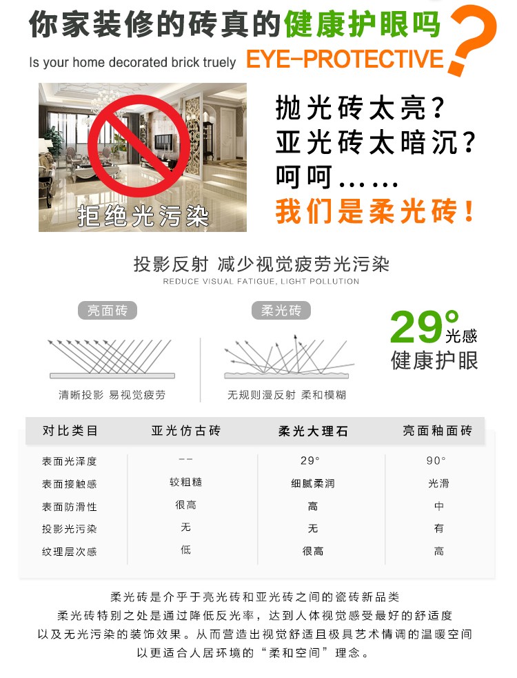 柔光瓷磚是磚面反射介于強(qiáng)光與弱光之間的一類(lèi)瓷磚,其結(jié)合亮光類(lèi)瓷磚的高調(diào)明艷裝飾和啞光類(lèi)瓷磚的低調(diào)內(nèi)斂搭配效果,通過(guò)動(dòng)態(tài)柔光蠟拋技術(shù),降低產(chǎn)品反光率,從而達(dá)到人體舒適的視覺(jué)感受以及無(wú)光污染的空間裝飾效果。優(yōu)點(diǎn):1.視覺(jué)舒適,無(wú)光污染 2.堅(jiān)固耐磨,不易刮花.